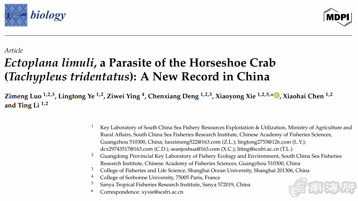 近日,在我国首次发现寄生于中华鲎体表的寄生虫——Ectoplana limuli,研究团队从成体中华鲎的附肢、口器等部位采集到寄生虫样本,经形态学与分子生物学鉴定,确认其为Ectoplana limuli,系中国首次发现,是中国涡虫新种,团队将其命名为“中华鲎涡虫”。该寄生虫呈长椭圆形扁平状,头尾半圆,背部有一对深黑色眼点,消化系统由口、咽和肠支构成,无独立肛门。18S rDNA基因测序显示,中华鲎涡虫与Nerpa fistulata具有较近的亲缘关系,但与Paucumara和 Baikalobia属的分支关系较远。该研究从寄生虫病害角度探讨中华鲎资源衰退的潜在因素,初步证实寄生虫与中华鲎死亡率存在潜在关联,为将来中华鲎养殖病害防治与产业健康发展提供基础信息。相关研究成果以“Ectoplana limuli, a Parasite of the Horseshoe Crab (Tachypleus tridentatus): A New Record in China”为题,发表于SCI期刊《Biology》(JCR一区,影响因子3.5,联合培养研究生罗梓萌为第一作者,颉晓勇副研究员为通讯作者)。