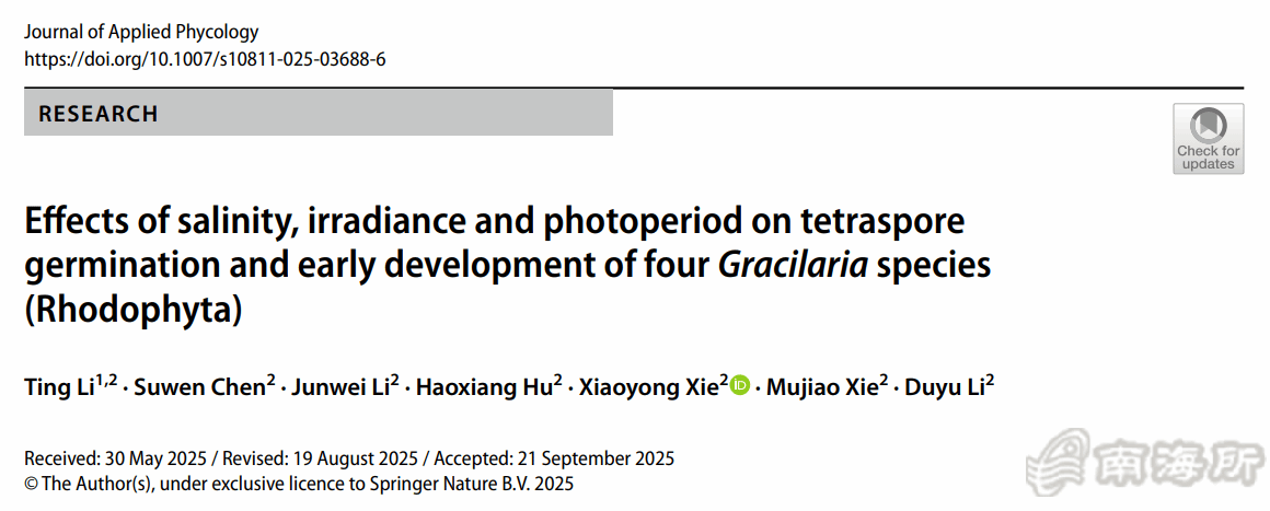 针对中华鲎食物选择受环境食物丰度影响及栖息地退化等问题。研究团队在前期海萝人工繁育成功基础上,进一步探索盐度、光照强度、光周期等环境因素对4种本地红藻早期发育的影响,研究建立的孢子繁殖技术为藻类持续利用提供无性繁殖替代方案,该方案既能缓解种质退化问题,又能支持长期栽培,为中华鲎稳定供饵与微生境营造奠定基础。研究还揭示了红藻物种间独特的光生理适应机制和盐度适应策略,为开展人工养殖和生态修复的应用提供了理论依据。该成果以“Effects of salinity, irradiance and photoperiod on tetraspore germination and early development of four Gracilaria species (Rhodophyta)”为题发表于SCI期刊《Journal of Applied Phycology》(JCR一区,影响因子3.0,李婷博士为第一作者,颉晓勇副研究员为通讯作者)。