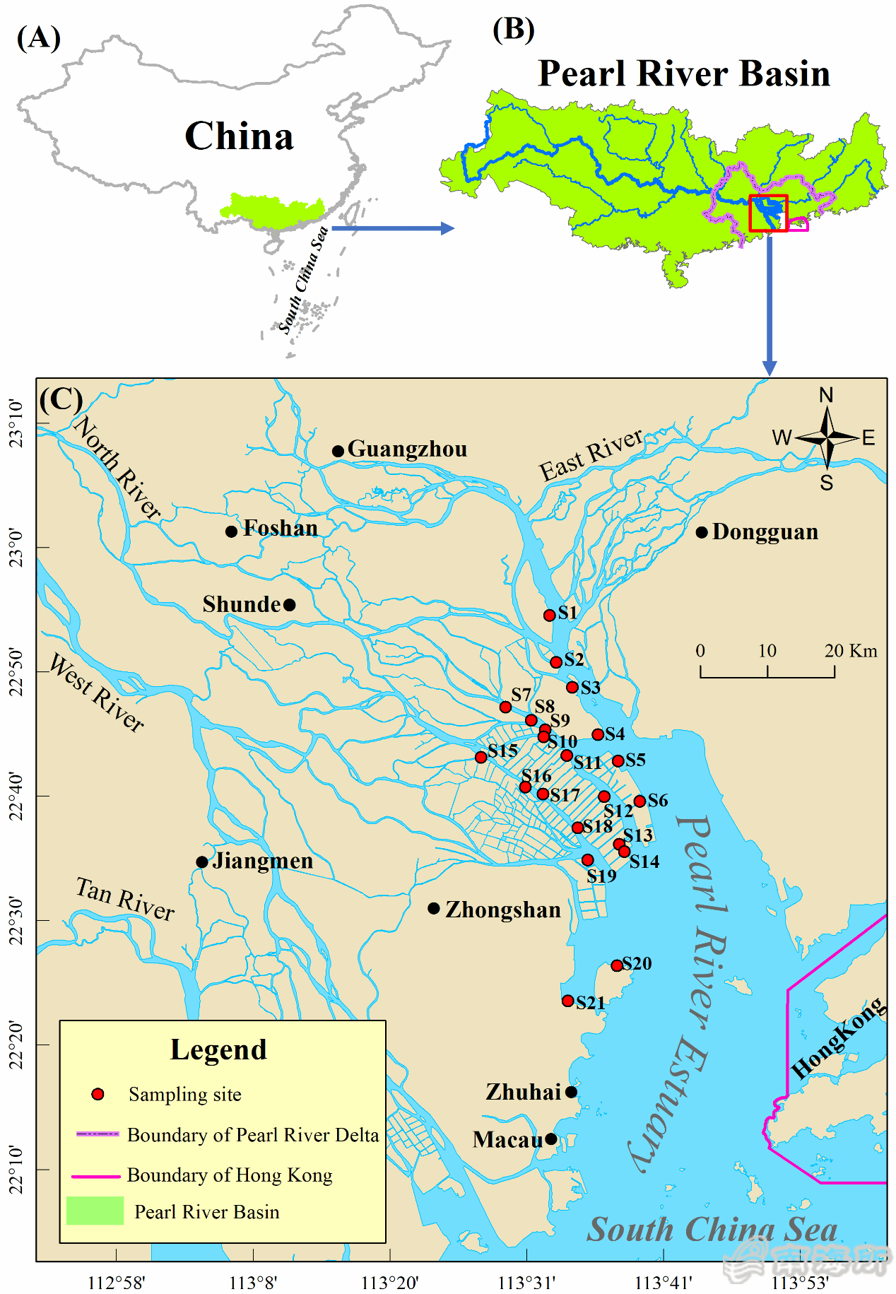 图2. 研究区域地图,显示(A、B)中国珠江口的位置及(C)珠江口潮间带采样点分布。