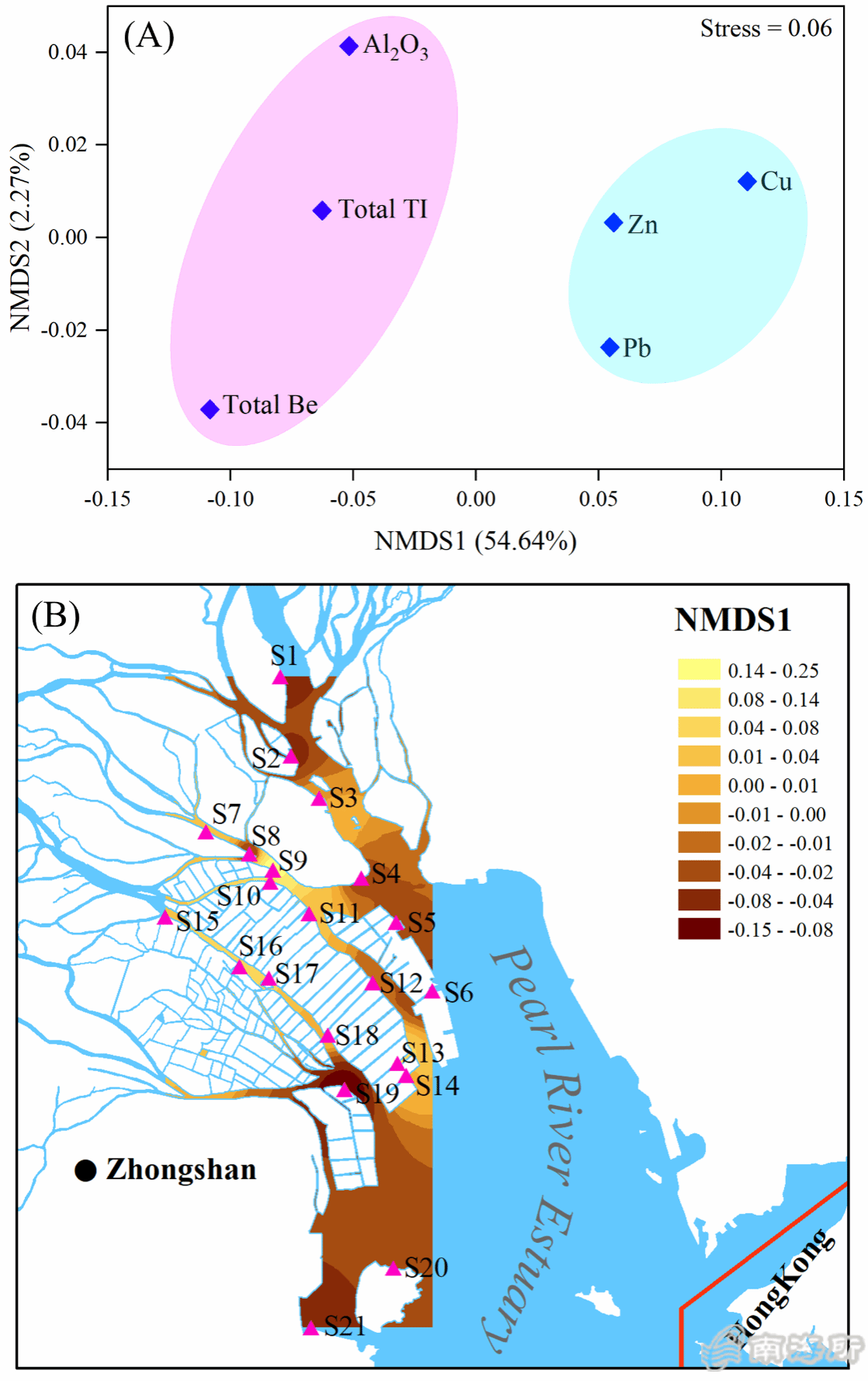 图5. 基于Bray-Curtis相似性矩阵的金属非度量多维标度分析(NMDS)排序图(A),以及珠江口潮间带表层沉积物中 NMS1 得分的空间分布(B)。