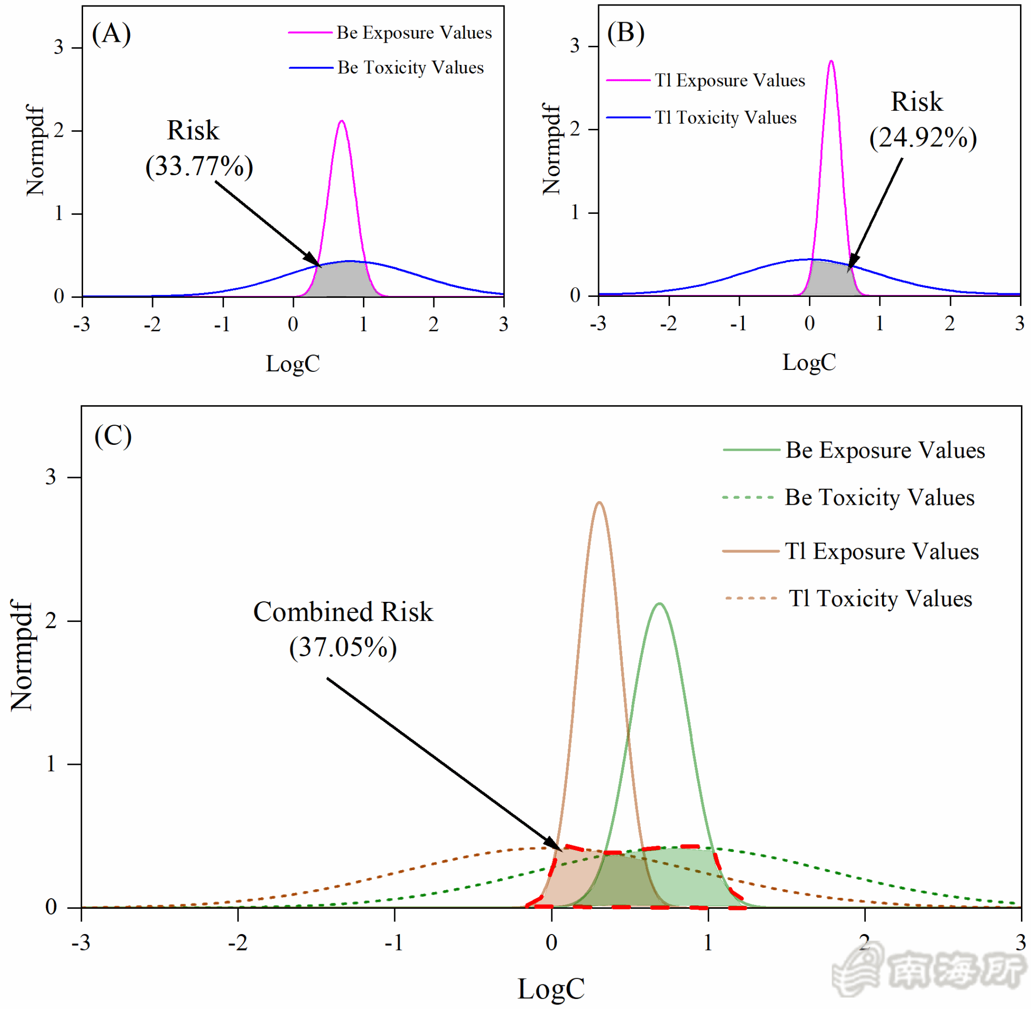 图7. 通过对数转换(LogC,底数为10)分析珠江口潮间带表层沉积物中铍(Be)和铊(Tl)的暴露概率与毒性概率密度分布(A、B),以及二者对水生生物区系的联合概率生态风险(C)。在图 C 中,红色多边形表示联合毒性效应。