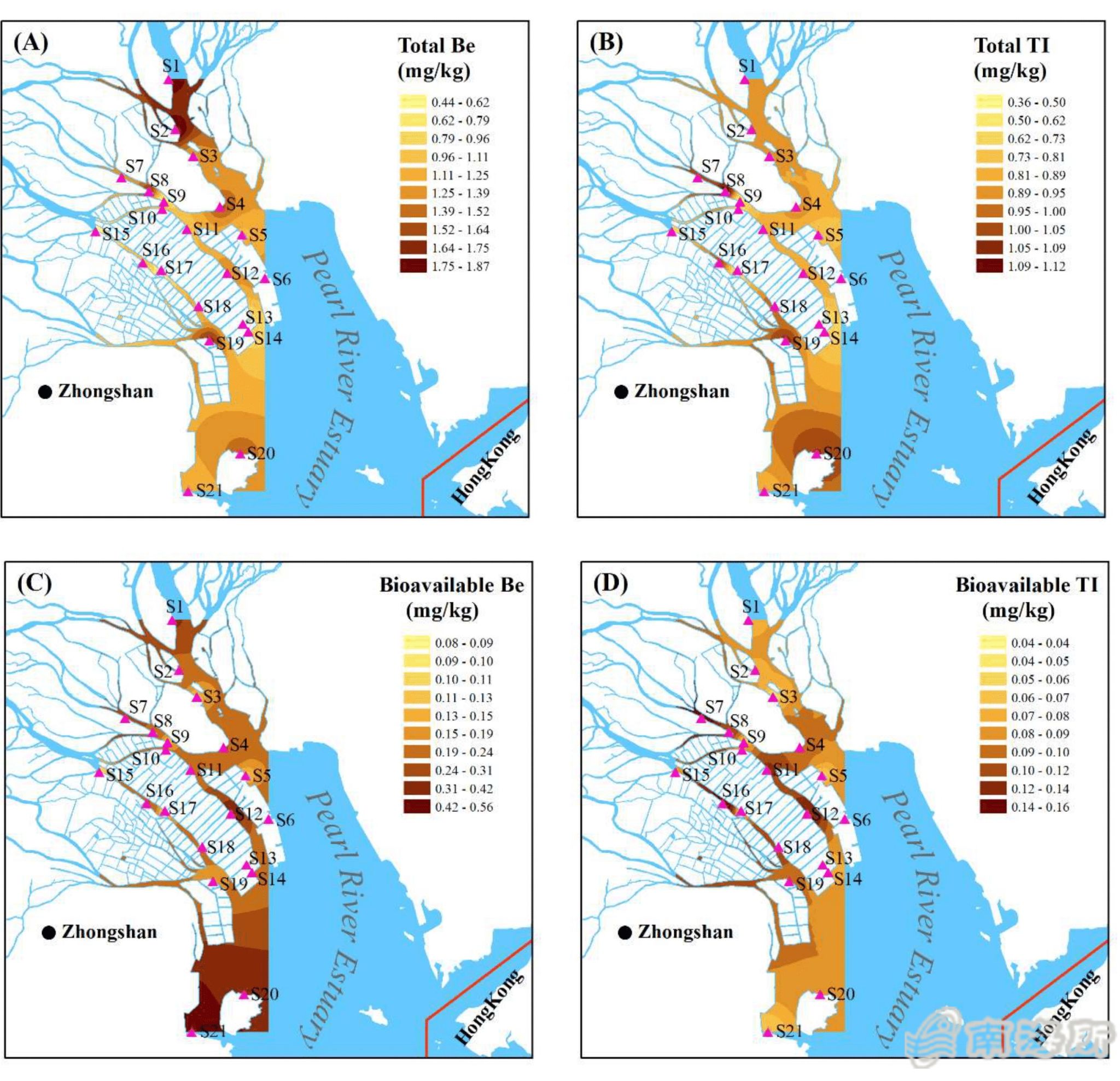 图4. 珠江口潮间带中总铍(Be)、总铊(Tl)、生物可利用铍(Be)和生物可利用铊(Tl)的空间分布。