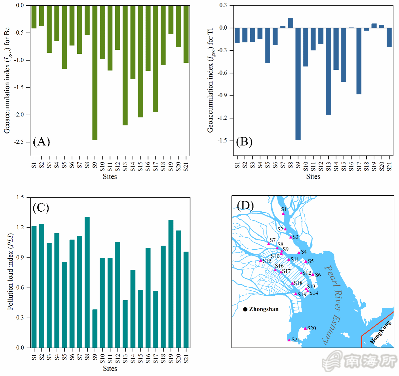 图6. 珠江口潮间带表层沉积物中铍(Be)和铊(Tl)的地累积指数(Igeo)(A、B)、污染负荷指数(PLI)(C),以及河口内采样点分布示意图(D)。