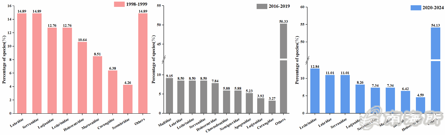 该研究采用延绳钓、手钓、流刺网、潜水捕捞、eDNA等多种调查方法,整合1998-2019年的历史调查数据和2020-2024年的现场调查数据,系统分析了美济礁珊瑚礁鱼类群落结构的长期演变特征。截至2024年,在美济礁共记录珊瑚礁鱼类353种,隶属14目61科162属。鱼类群落以小型鱼类(43.81%)和肉食性鱼类(74.92%)为主;大型肉食性鱼类物种数比例较1998-1999年的水平显著下降,小型肉食性鱼类比例明显增加,且肉食性鱼类整体平均体长与体重显著降低;不同时期之间肉食性鱼类物种的相似性系数较低,均表现为“极不相似”或“不相似”,反映出群落组成显著更替。与2016-2019年相比,2020-2024年期间大型肉食性鱼类以及珊瑚礁依赖程度较高的鮨科等类群的物种占比明显回升;与之相反,小型肉食性鱼类及对活珊瑚依赖程度较低的羊鱼科等类群的占比则显著下降,这种变化趋势显示出美济礁2019年生态修复后鱼类资源正逐步恢复。珊瑚礁鱼类群落长期监测能更加全面揭示区域鱼类演替规律,对推动珊瑚礁生态系统的健康与恢复具有重要指导意义。